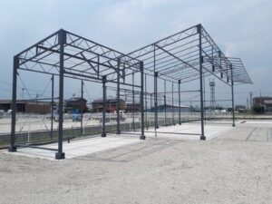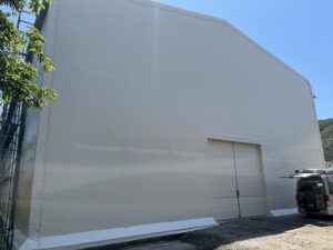 テント倉庫 三重県に施工 2020.10.16 テント倉庫 建設の場所 三重県 種別 テント倉庫 サイズ ワイド20m×奥行き22m 使用したテント生地 ハリケーングレー&内幕ガラスクロス オプション 側面入口、庇二箇所、 担当者のひとこと 440㎡のテントの施工をしました。広々としたテント倉庫で、開口部も二箇所ありとても使いがってが良さそうです。鉄骨建方から生地張り、不破材内幕まで4日半かかりました。