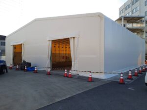 大型の営業倉庫が完成しました |熊本県 2024.05.30 テント倉庫 建設の場所 熊本県 種別 テント倉庫 サイズ W20×L39.8×H9 使用したテント生地 ターポロンG3000Ⅱ オプション 強制換気ベンチレーター、雨樋、内幕、LED照明、自動火災報知設備、庇 担当者のひとこと 営業倉庫をテント構造にて建築しました。物流の変革や法令遵守にも対応できる営業倉庫です。コストを抑えやすいということもありますが、基礎着工から2カ月以内に竣工とスピードも大きな魅力です。