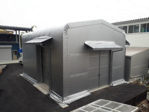 屋外塗装スペースに設置しました。雨天時でも作業が可能です。既設の大型ホイストを利用できる状態で、テントスペースを移動式にすることで作業場の有効利用を確保しました。 |