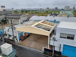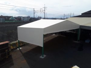 荷捌きテントを制作しました。雨仕舞は既存の屋根を利用し、空間を最大限活用するにしました。|岐阜県 2023.06.26 上屋テント 建設の場所 岐阜県 種別 上屋テント 使用したテント生地 ウルトラマックス 担当者のひとこと 通路部分となる箇所に荷捌きテントを設置致しました。雨が降っても濡れずに荷物の出し入れが可能です。また高さを十分に確保することでウイング車が開閉を行うことも問題ありません。