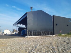 荷捌きテントを建築しました|愛知県 2024.01.16 上屋テント 建設の場所 愛知県 種別 荷捌きテント 使用したテント生地 ウルトラマックス 担当者のひとこと 既存の建物の形状に合わせ荷捌きテントを併設しました。出荷時の積み込み作業を雨を気にせず対応できるようにすることで生産性向上に寄与する設計となっています。