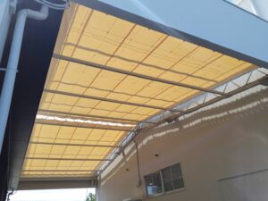 開閉式テントの生地の張り替えを行いました。工場が休日の期間に対応し業務に支障がないようにさせて頂きました。