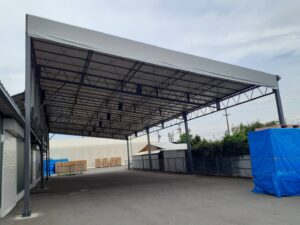 開閉式のテント倉庫を建築しました。日除けとして使用できます。