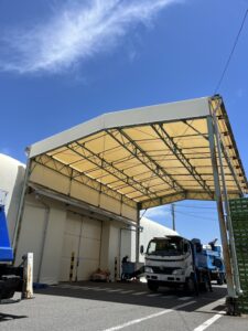 荷捌きテントの生地貼り替えをしました。倉庫間に荷捌きテントを設置し、作業効率が向上します。