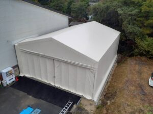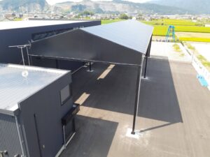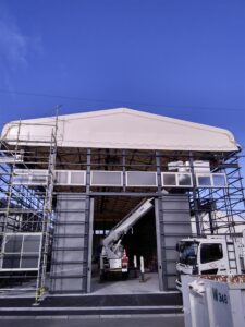 真っ黒な上屋テント建設中!!|岐阜県神戸町